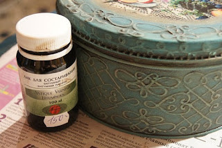 Εκτός από το κουτί θα χρειαστείτε χαρτί η χαρτοπετσέτα, κόλλα και βερνίκι decoupage, ακρυλικά χρώματα (λευκό, καφέ, τυρκουάζ), καφέ ή μπρονζέ πατίνα, μπογιά περιγράμματος και stencil ή ένα οποιοδήποτε σχέδιο/μπορντούρα που μπορείτε να σχεδιάσετε ή να "ξεπατικώσετε" πάνω σε χαρτί από το internet, από ένα κομμάτι δαντέλα κλπ.